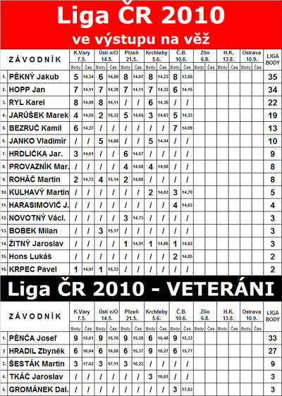 Na čtyřvěži a za účasti České televize proběhl v Českých Budějovicích pátý závod Ligy ČR 2010 ve výstupu na věž. V hlavní kategorii vyhrál ostravský Jakub Pěkný excelentním časem 13,85s. V kategorii veteránů ve věku 40let a starších zvítězil již počtvrté blanenský Josef Pěnča(48let) s časem 15,33s.