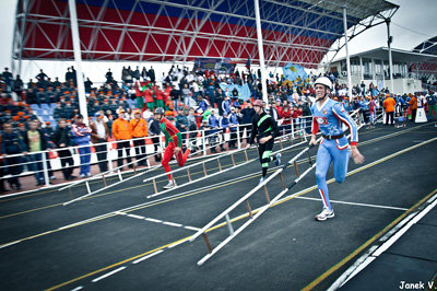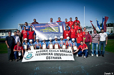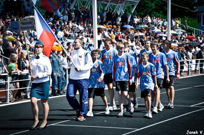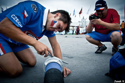 Odpolední program se nesl ve znamení slavnostního zahájení, představení družstev a doprovodného programu, který sledoval zaplněný stadion, na němž se občas dala zahlédnout i česká vlajka. Zlatým hřebem programu bylo večerní finále jednotlivých kategorií. Mezi mladšími se na start postavil Honza Gášek. Start se mu povedl perfektně. Pod věží byl první a hnal se nahoru. V přemíře snahy ovšem při zálezu zakopnul o parapet a oknem dovnitř proletěl po hlavě. Naštěstí se mu podařilo trefit došlapy a časomíru zastavil ve třetím nejlepším čase. První česká medaile byla na světě!!!