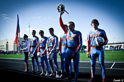 První štafeta se klukům moc nepovedla. Franta Kunovský se při seběhu z kladiny zranil a k poslední předávce jen dokulhal. Čas 62,16 stačil „jen“ na 4. místo.